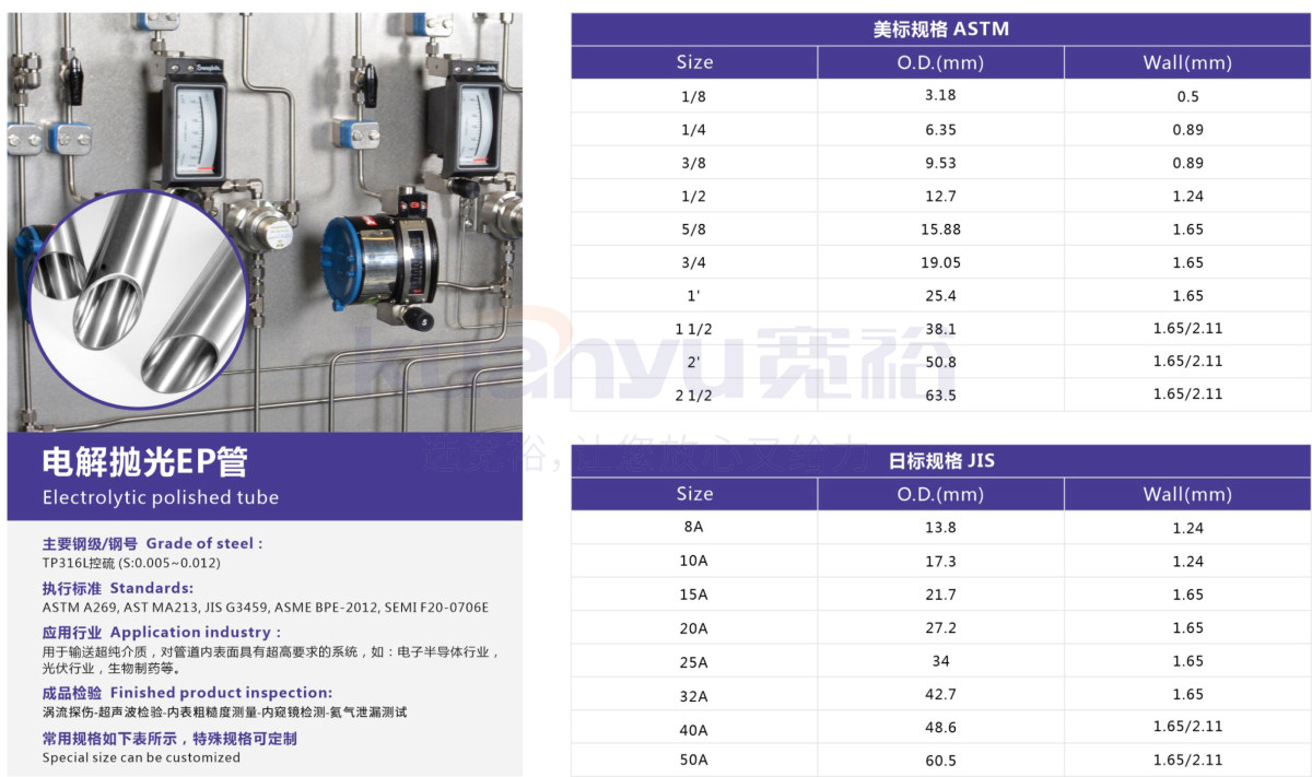 1.表面光潔度:針對(duì)鋼管的內(nèi)外表面進(jìn)行拋光處理,使得鋼管表面呈亮面;也就是我們常說(shuō)的鏡面。主要是防止管內(nèi)走的流體物質(zhì)在管內(nèi)形成掛壁,時(shí)間長(zhǎng)了容易污染而且形成管內(nèi)堵塞。