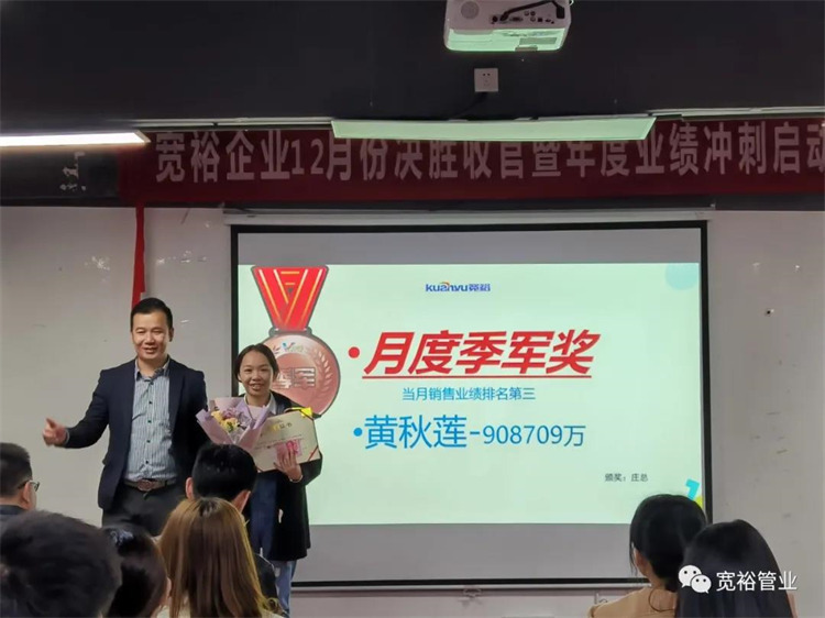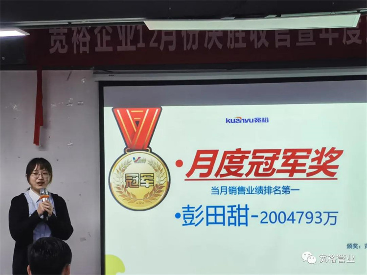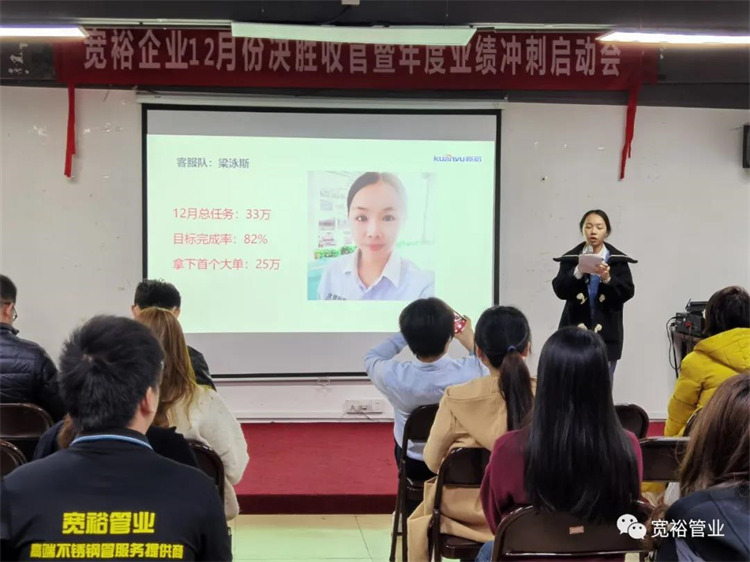 動(dòng)感滿滿的舞蹈之后正式開(kāi)啟對(duì)12月1-13日的銷售業(yè)績(jī)回顧,并對(duì)個(gè)人銷量前十、團(tuán)隊(duì)業(yè)績(jī)完成情況、團(tuán)隊(duì)PK情況等進(jìn)行了總結(jié)。在過(guò)去的13天里,已經(jīng)涌現(xiàn)出了多位優(yōu)秀的將士,他們分別是以100%業(yè)績(jī)率先沖刺的00后新生代“小莊”,還有首個(gè)拿下本月25萬(wàn)大單的小斯---從跟單員通過(guò)不斷的努力成為優(yōu)秀的銷售工程師。更有通過(guò)前期不斷積累了成功開(kāi)拓經(jīng)驗(yàn)的來(lái)自無(wú)敵隊(duì)的小黃,12月至今已經(jīng)開(kāi)發(fā)了6個(gè)新客戶,現(xiàn)場(chǎng)更是迎來(lái)了“哇塞”的喝彩聲一片!在此小編也僅代表寬裕管業(yè)對(duì)各位優(yōu)秀戰(zhàn)士的優(yōu)異成績(jī)表示大寫(xiě)的點(diǎn)贊!你們是最棒的!