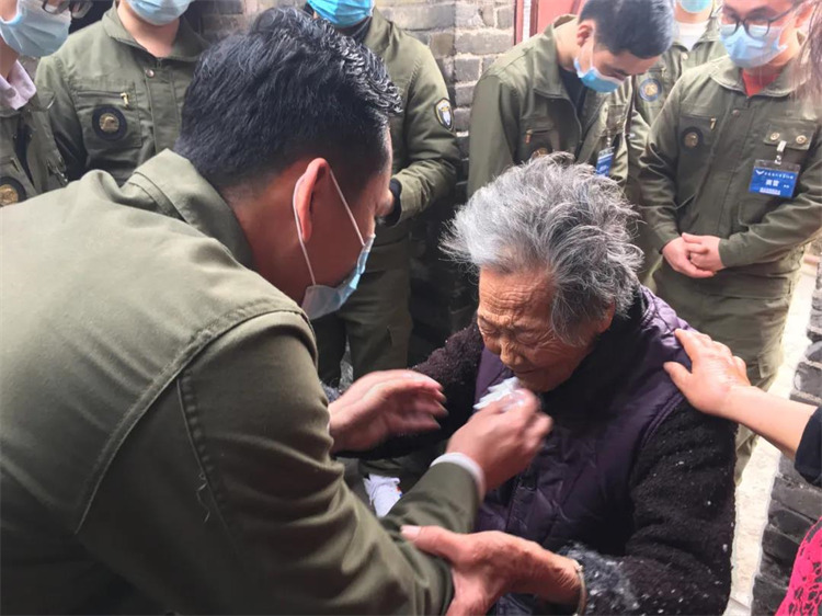 ▲突擊隊(duì)的武一為婆婆擦眼淚。婆婆有3個(gè)女兒1個(gè)兒子,可是她卻只有一個(gè)人住在一間已經(jīng)破敗不堪的小房子里,里面?zhèn)鱽黻囮嚨膼撼?。她頭發(fā)很長,腿有撞傷流血而未清除的淤血。她一直對我們說感謝,動(dòng)情處熱淚凝眶,見者無不動(dòng)容!與物質(zhì)相比,更多的老人家們更需要的是親人,子女的陪伴和關(guān)愛!一直崇尚以孝為先的社會(huì),原來依然有那么多不為人知的“隱秘的角落”!