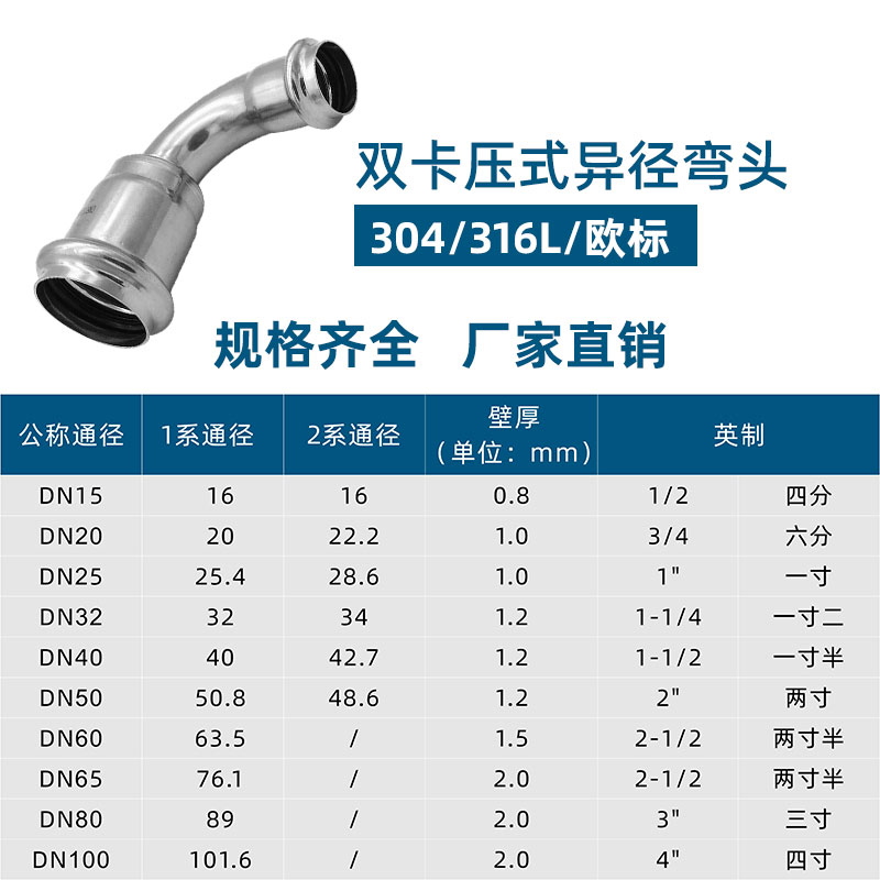 不銹鋼水管雙卡壓管件,不銹鋼水管雙卡壓式異徑彎頭,304 316L不銹鋼材質(zhì),堅(jiān)固耐用,光滑內(nèi)壁,不易生銹,耐腐防漏。